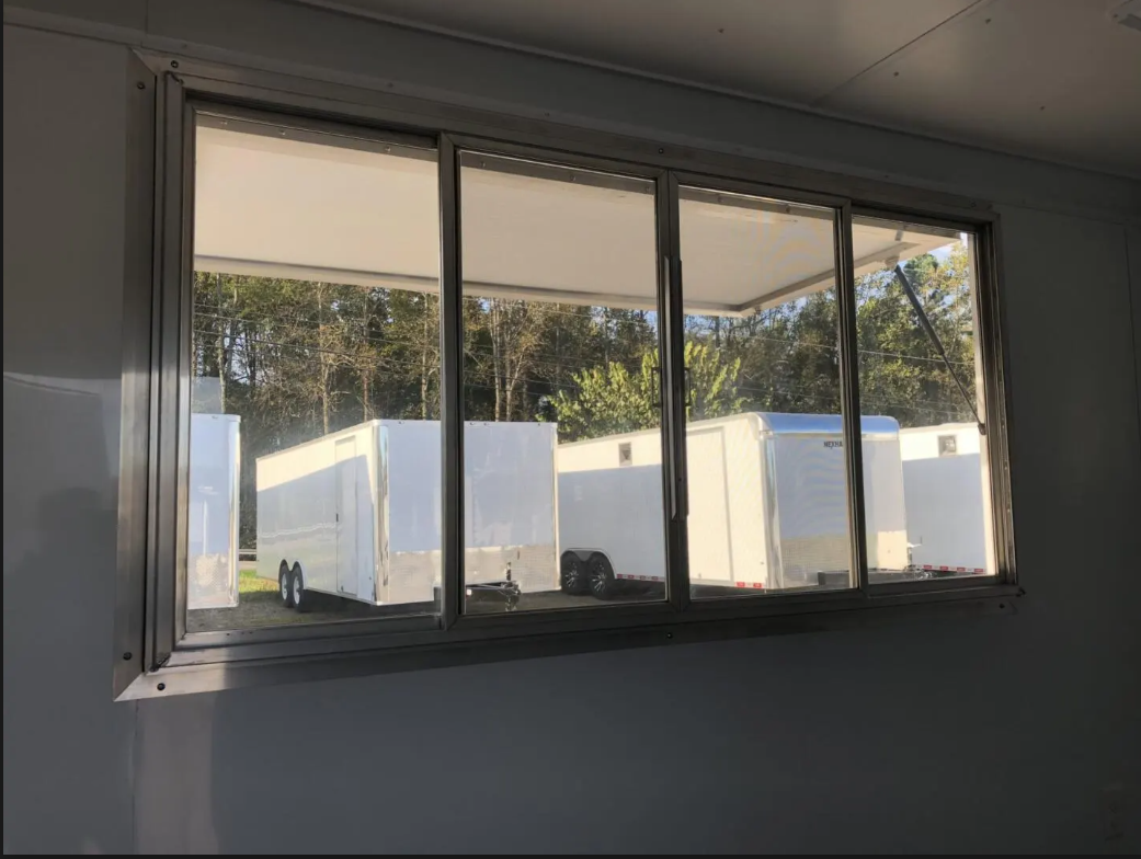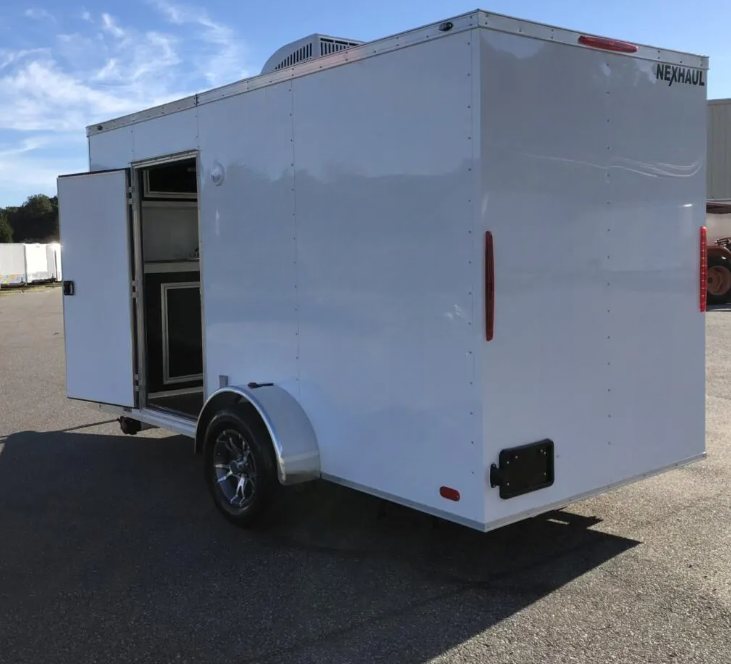 The Nexhaul 6x12 Vending Trailer is built for serious business—no gimmicks, no nonsense, just a rock-solid setup ready to make you money. Whether you're launching a food trailer, boutique, or custom mobile shop, this rig has everything you need. The 48"x72" vending window with sliding glass and a sturdy 72” shelf gives you a professional workspace, while the black upper cabinets, white aluminum walls, and coin rubber flooring create a clean, functional interior. A 15K AC with a heat pump keeps things comfortable, and the built-in sink setup—including a handwash sink, base cabinet, fresh and waste tanks, water pump, and water heater—meets health requirements with ease. The .030 semi-screwless aluminum exterior, one-piece roof, and 24” aluminum tread plate stone guard give it durability and a sleek look. With a 3/4” engineered floor backed by a 15-year warranty, 16” on-center construction, and a low-sitting drop axle for easy access, this trailer is built to work. It rolls on 15” radial tires and aluminum wheels, powered by a 12V battery with a vented box and a 70AMP smart charger. LED lighting inside and out, including porch lights and 45-degree exterior LEDs, ensures visibility in any conditions. With a 2" ball coupler, 4-pin flat plug, and safety chains, it’s ready to haul. If you're serious about your business, this is the trailer that gets the job done.