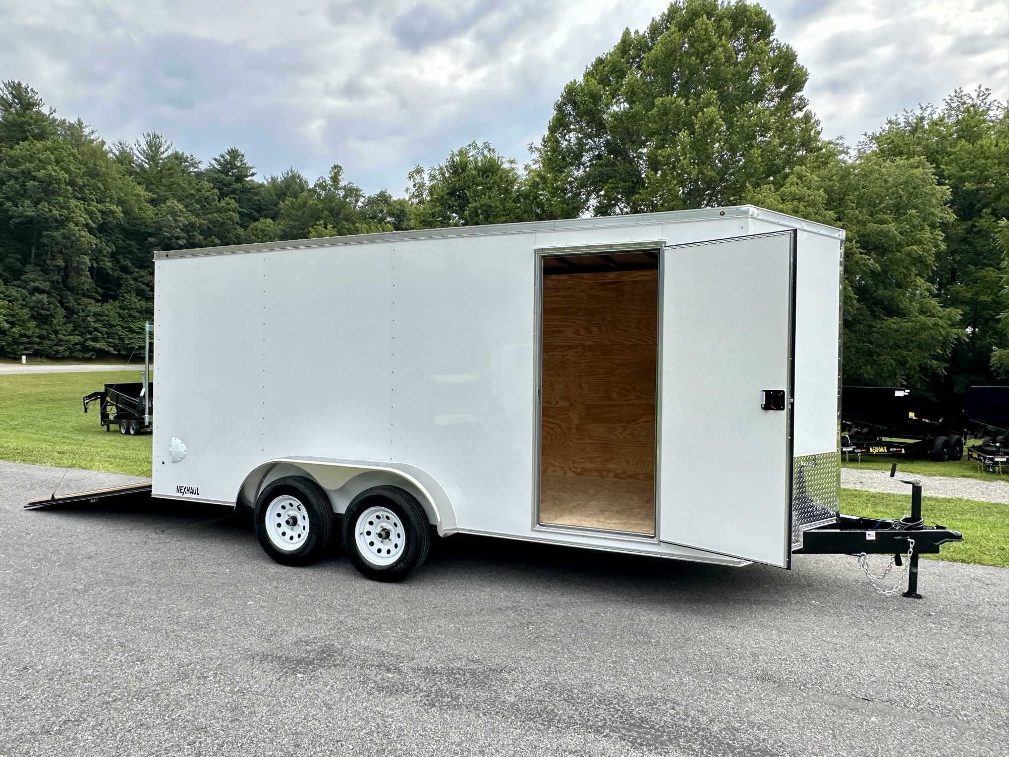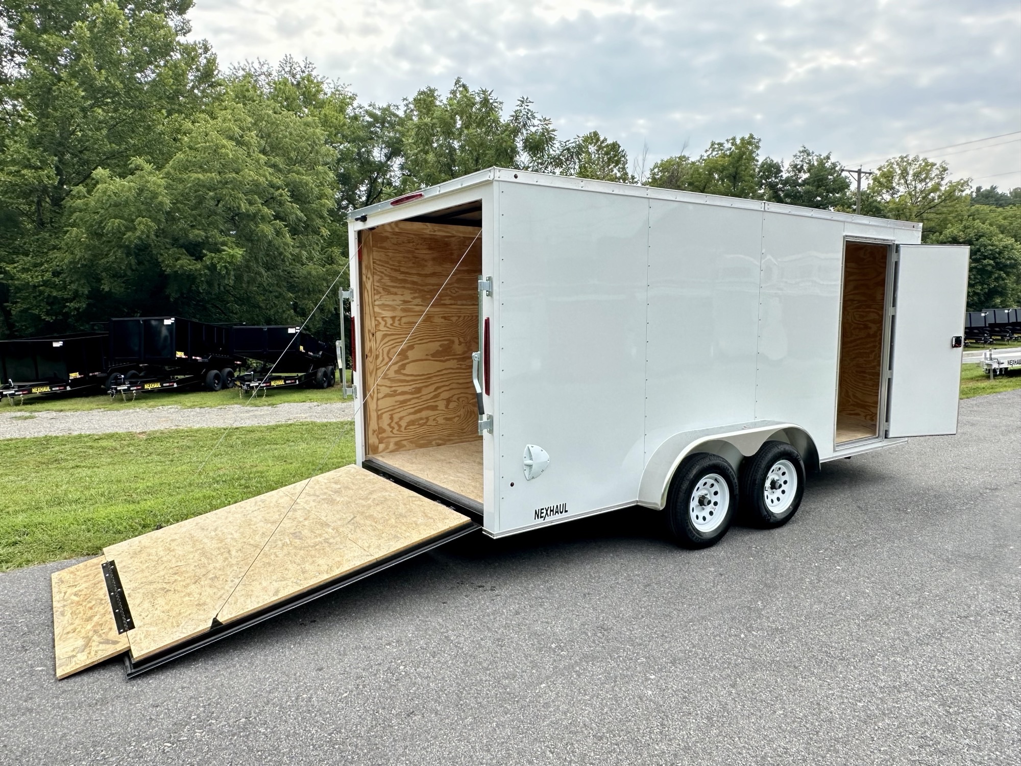 The Nexhaul Bullet Series packs power and performance into every inch, starting with a 6" tube tongue and a 3/4" engineered floor, covered by a 15-year warranty. With a semi-screwless .030 aluminum exterior, the trailer is built tough to last. Its 16" on-center construction for the floor, walls, and ceiling, along with a one-piece aluminum roof, ensures ultimate durability. The 32" door with flush lock and spring-assist ramp door provide effortless access, while the 24" aluminum tread plate stone guard protects the trailer from the elements. Aluminum fenders, 3500LB EZ Lube axles, and electric brakes add serious strength, while the 15" radial tires handle any challenge. With a 78" interior height and a 7000LB GVW, this V-nose trailer offers plenty of room and can tackle any load. Plastic side flow vents ensure airflow, and wood walls provide additional stability. Equipped with LED lights, a 2-5/16" ball coupler, ramp flap extension, 7-way RV-style plug, breakaway safety kit, 12V LED interior light, and safety chains, this trailer is ready for any job. Available in a variety of colors—call for availability.