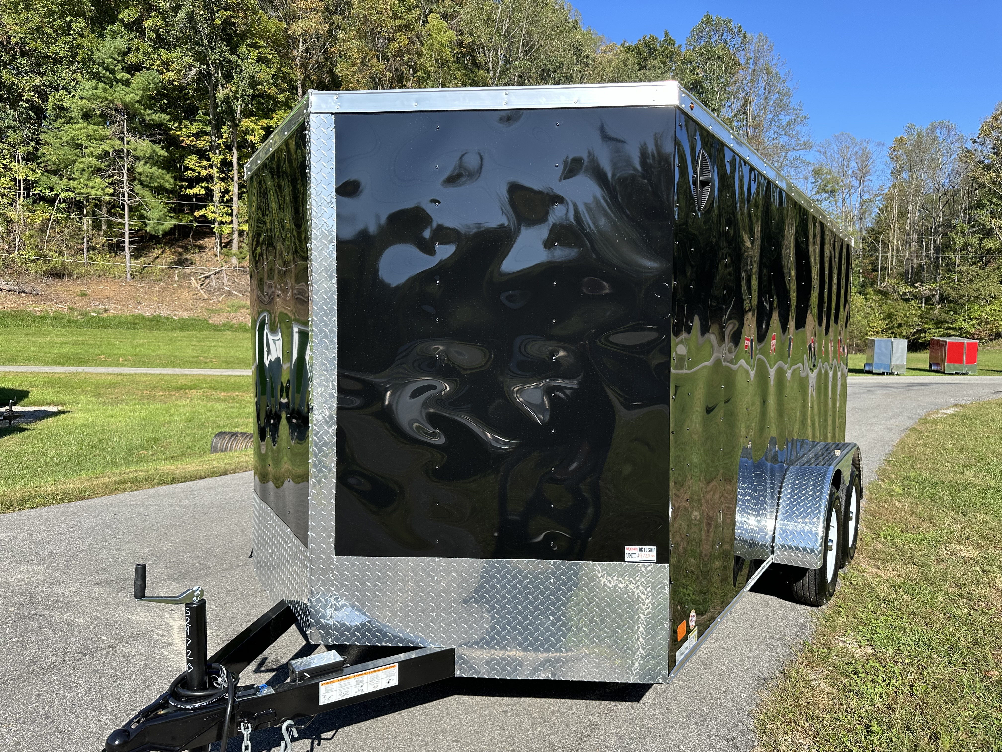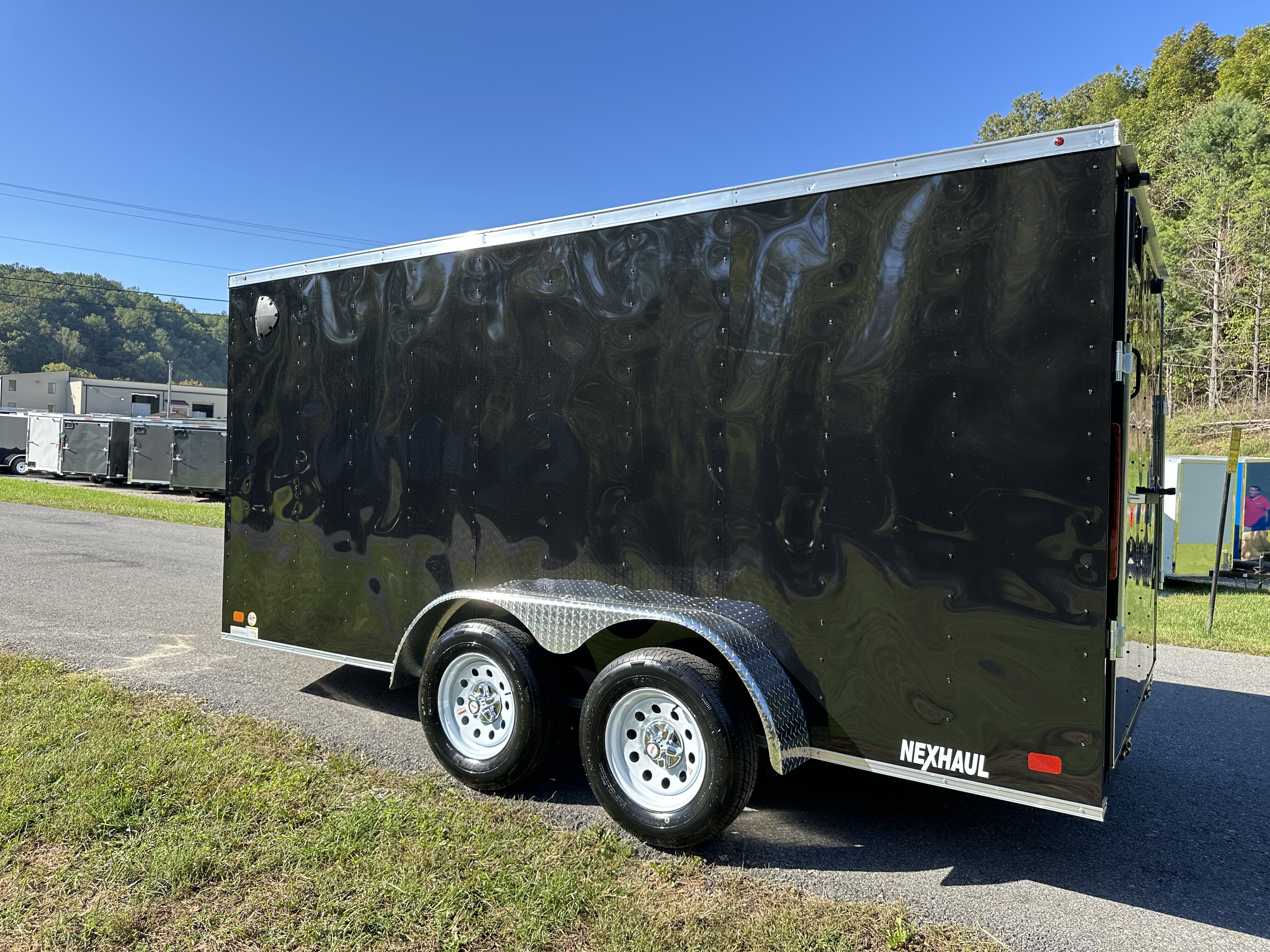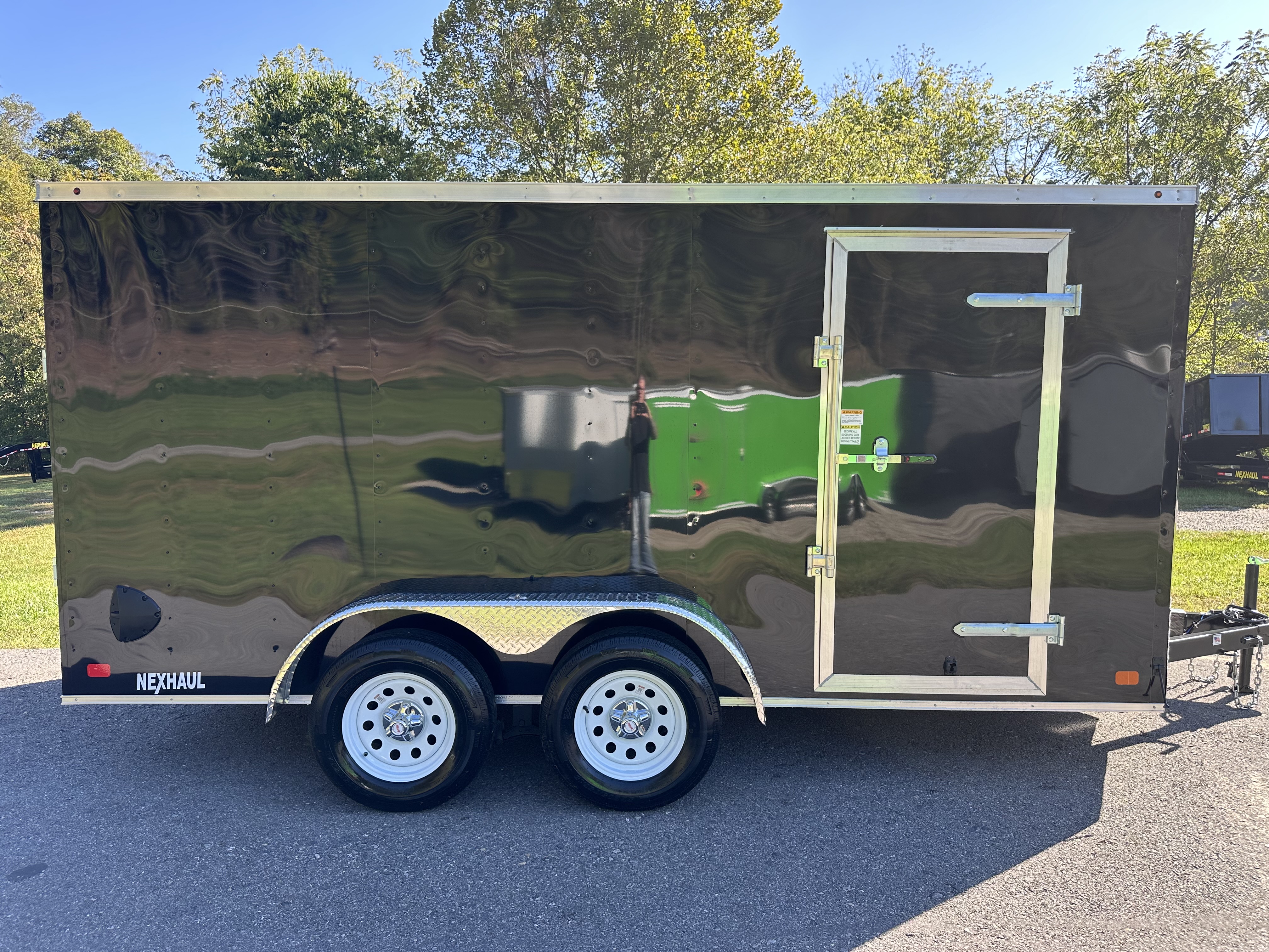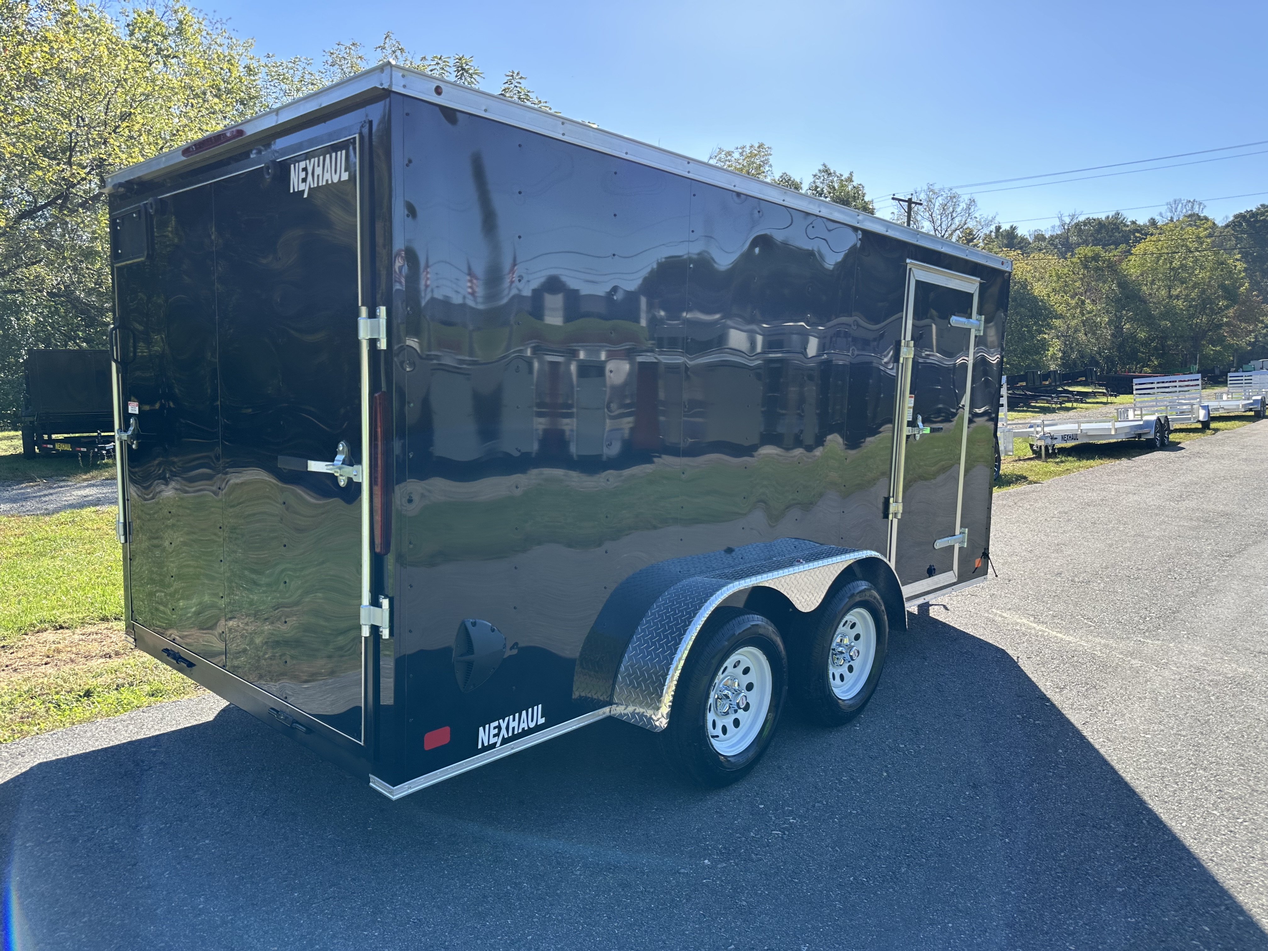 The Nexhaul Magnum Series Trailer combines solid craftsmanship with dependable features to meet your hauling needs. Built with two 3,500LB 4" drop brake axles and EZ Lube hubs, this trailer is engineered for smooth towing and long-term reliability. Its primed and painted frame is complemented by a 16" aluminum tread plate stone guard and .024 gauge screwed exterior aluminum for added durability and a polished look. With a 72" interior height, 3/8" wood interior walls, and 3/4" wood flooring, it offers a strong and spacious interior for versatile cargo protection. Designed for convenience, it features a 32" x 66" side door with a bar lock, a rear ramp door, and a V-nose with tread plate for easy loading and efficient aerodynamics. A one-piece aluminum roof with high-tech sealant, 24" roof bows, plastic side flow vents, and DOT-approved exterior lighting ensure excellent weatherproofing, ventilation, and safety. Additional features include radial tires, aluminum tread plate fenders, a 2,000LB manual tongue jack, a 7-way electrical plug, and a 2 5/16" coupler with safety chains, making the Magnum Series Trailer a tough and reliable choice for everyday use. Price for black and white only. Additional colors, add $150