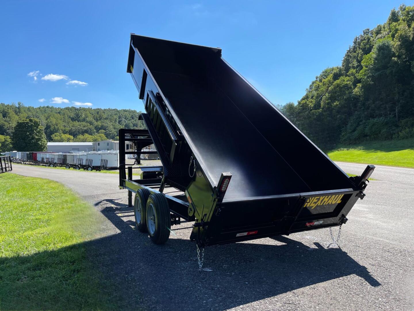 The Nexhaul 17K Dump Trailer is the ultimate heavy-duty solution for demanding jobs, built with a robust 17,000 GVWR and dual 8,000LB axles with electric brakes for unparalleled performance. Its dual-cylinder hydraulic system with power up and down ensures smooth, efficient operation, all controlled by a wired remote. Constructed with durability in mind, it features a combo gate for spreading and splitting, stabilizing outriggers, stake pockets, and bed height extension brackets for maximum versatility. Equipped with 17.5” heavy-duty steel wheels with radial tires, EZ lube hubs, and DOT tape, this trailer is ready to hit the road with confidence. Convenience meets reliability with LED lights, a lockable toolbox, (4) in-bed D-rings, heavy-duty safety chains, a breakaway kit, and a spare tire mount (optional spare tire shown). Finished with a tough powder coat and powered by a super-duty battery, the Nexhaul 17K Dump Trailer is built to deliver strength, performance, and durability for every challenge.