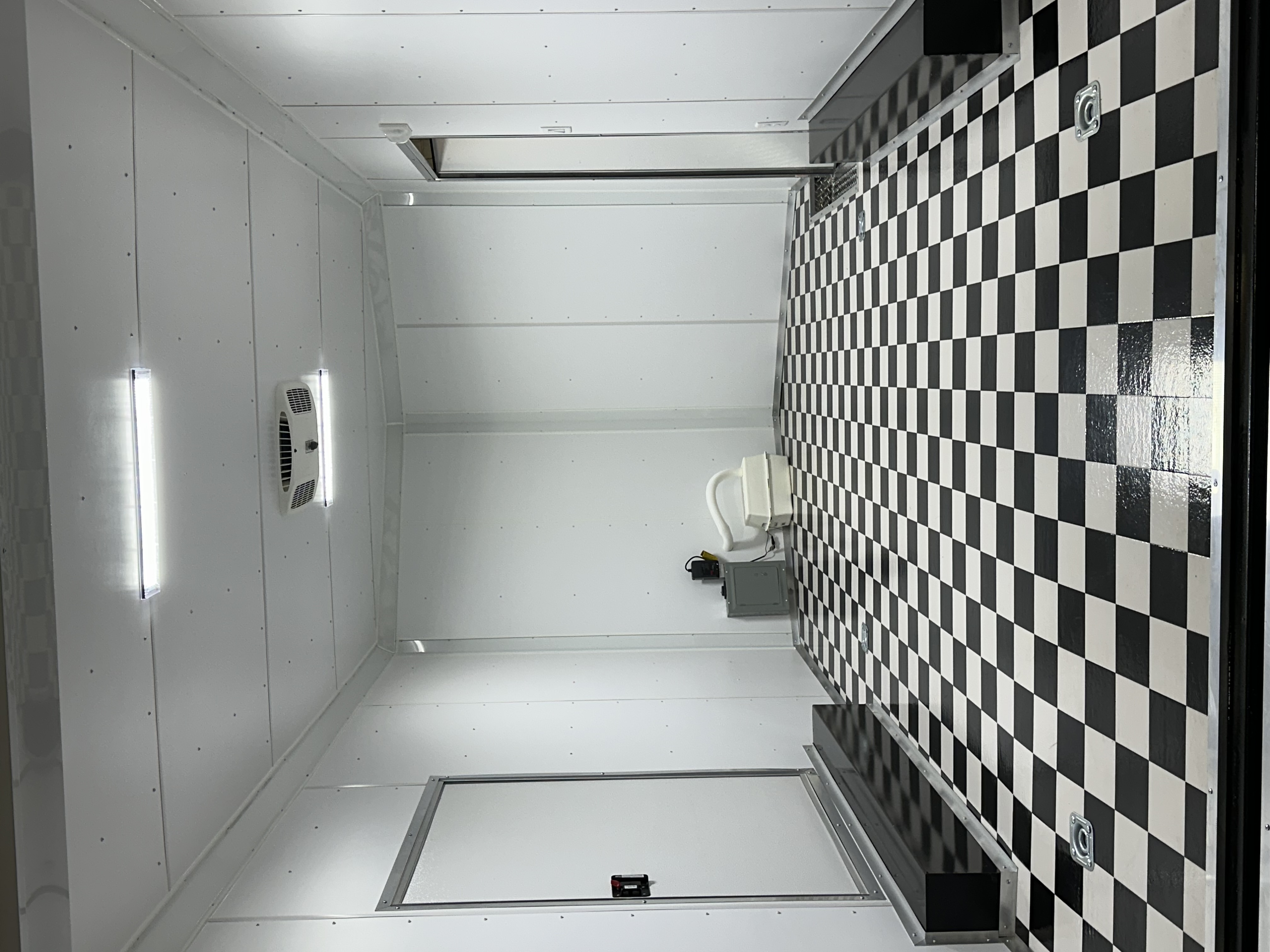Step inside and you are greeted by a bold black and white checkered floor that sets the tone for a race-inspired interior. Smooth white vinyl walls and ceiling keep the space bright, clean, and professional. Durable engineered flooring underneath ensures long-lasting performance, even under heavy loads.