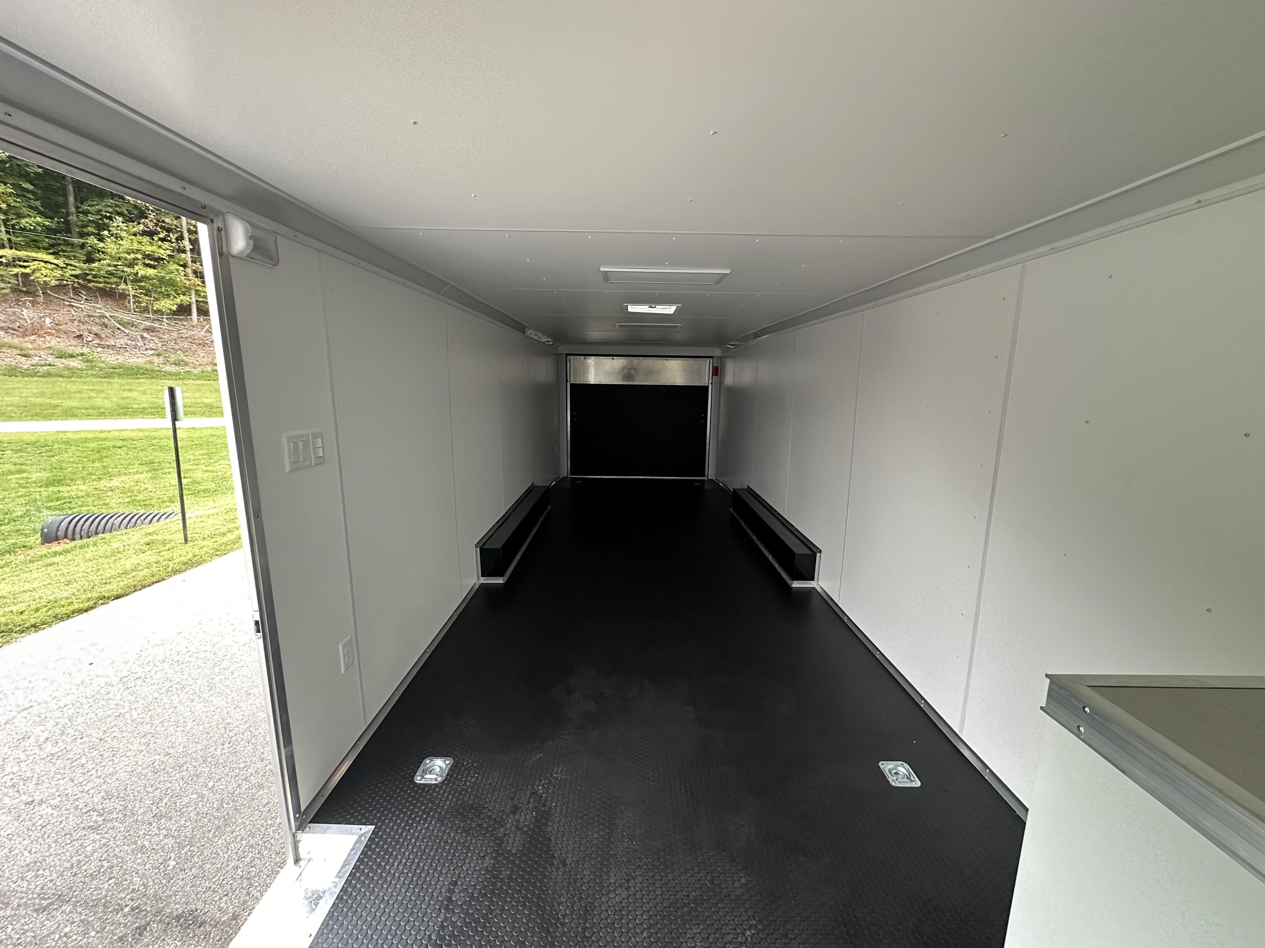 This trailer comes equipped with 3/4" engineered flooring with a 15-year warranty and coin rubber flooring for added durability and grip. The 5200LB torsion axle upgrade, spread axle configuration, and Dexter torsion axles with electric brakes on all 4 wheels ensure a smooth and reliable ride. Its one-piece aluminum roof, .030 screwed aluminum exterior, and aluminum wheels with a 6-lug configuration make it as rugged as it is stylish. The aluminum fenders and V-nose design give it a sleek, aerodynamic edge, while the dove tail ensures ease of loading and unloading. Inside, you'll find straight upper cabinets, an L-shape base cabinet, and white vinyl walls and ceilings, offering both functionality and a polished look. For power, it’s equipped with (4) 12"X24" 12-volt LED panel lights, (2) 24" exterior 12V flood lights at 45 degrees, (3) 110V receptacles, and a GFI 110V receptacle for added convenience. Additional features include a 36"X36" generator door, (1) USB port, 50-amp RV inlet, 50-amp RV cord, 70-amp smart charger, and a 12V battery with box. Loading and unloading are made easier with a 48" side door with flush lock, spring assist ramp door with flap, and (4) D-rings installed in the floor for secure tie-downs. The trailer also features LED lights, a 7-way RV plug, and safety chains, making it a great choice for work or play!